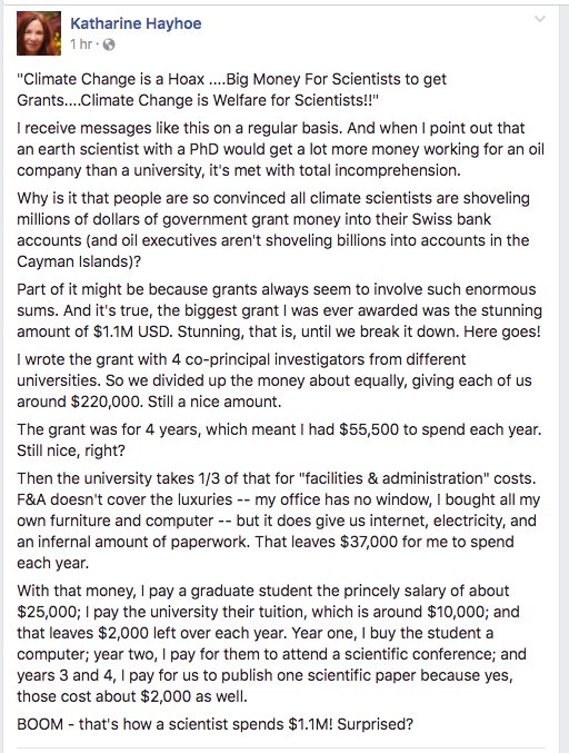 Ah, those big government grants that all those global climate change scientists are living high on the hog from… only there's the actual reality of the economics. So, a $1.1m grant basically pays for 1 of the 4 grantees to have a graduate student help for 4 years and to pay to publish one paper. Yep. That's pretty much how is goes (note, while this is just quick accounting, there's also no expense included to cover the person who helps write the grant application and helps manage the money and reporting aspects (waves at friend who has that job). (Grokked from Laura J. Mixon)